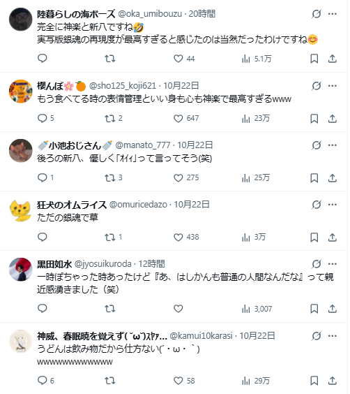 這段對話加上橋本那副「邊吃邊理直氣壯」的樣子,完美還原了神樂本人。貼文一出立刻馬上引起話題,底下留言區滿滿都是「太像神樂了吧!」、「現實版神樂無誤!」之類的反應。
