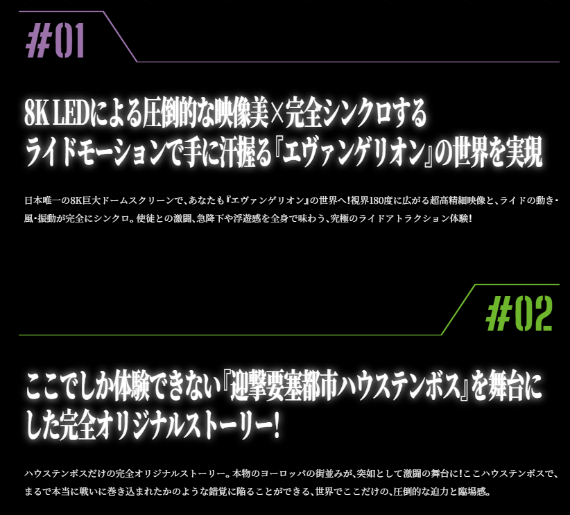 全新遊樂設施「Evangelion The Ride -8K-」採用 8K LED穹頂巨型螢幕與最新動態座椅系統,讓遊客以「身歷其境」的方式投入EVA的戰鬥世界。高達 19倍Full HD的超高畫質影像,搭配可模擬急降、振動與漂浮感的機械動態,打造出宛如親臨使徒襲來現場的震撼體驗。