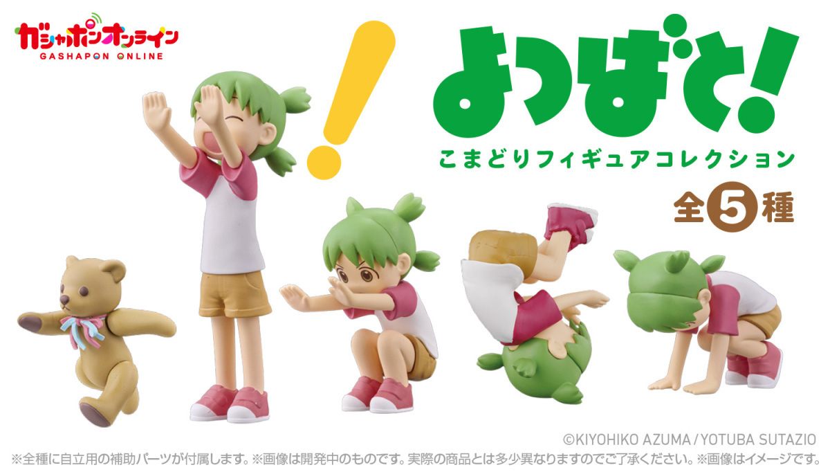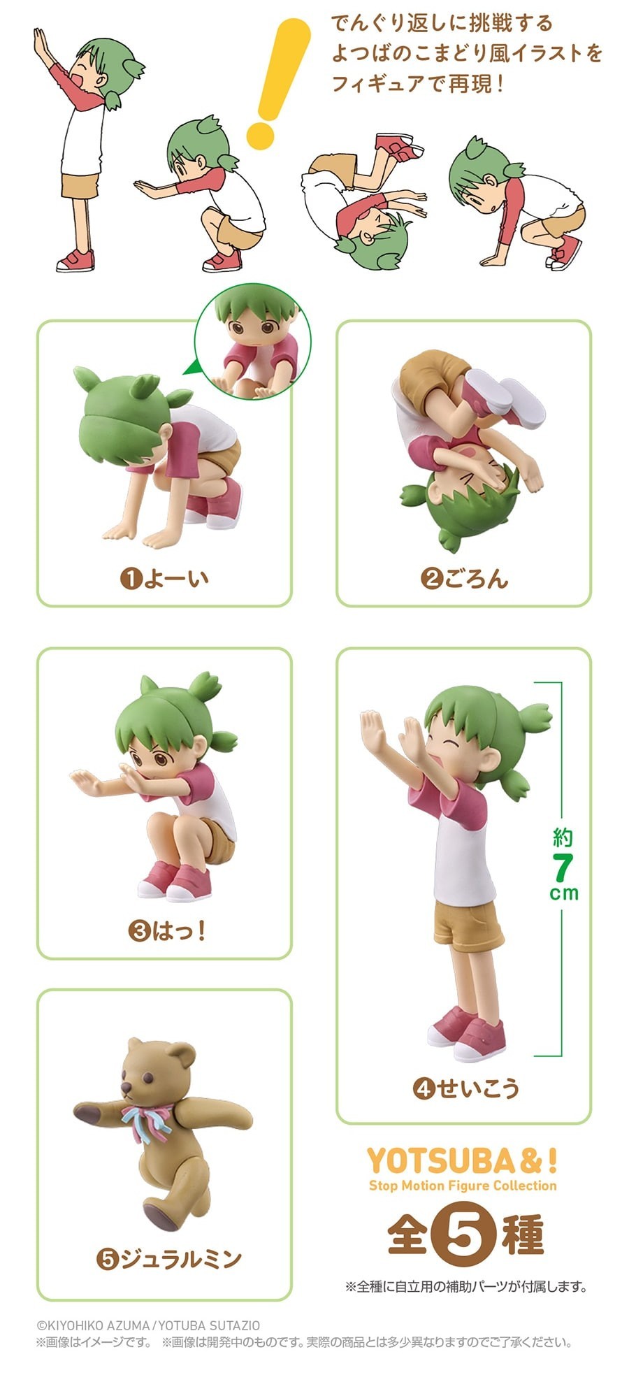 「GASHAPON 四葉妹妹!前滾翻人物收藏」轉蛋,將可愛的四葉妹妹前滾翻的模樣立體化!以定格動畫為靈感,分解四葉妹妹前滾翻時的四個動作:準備(よーい)→咕咚(ごろん)→哈!(はっ!)→成功(せいこう),可愛的表情與生動的姿勢,收藏整套就能重現翻跟斗的挑戰~另外還有四葉妹妹心愛的泰迪熊茱拉魯敏!