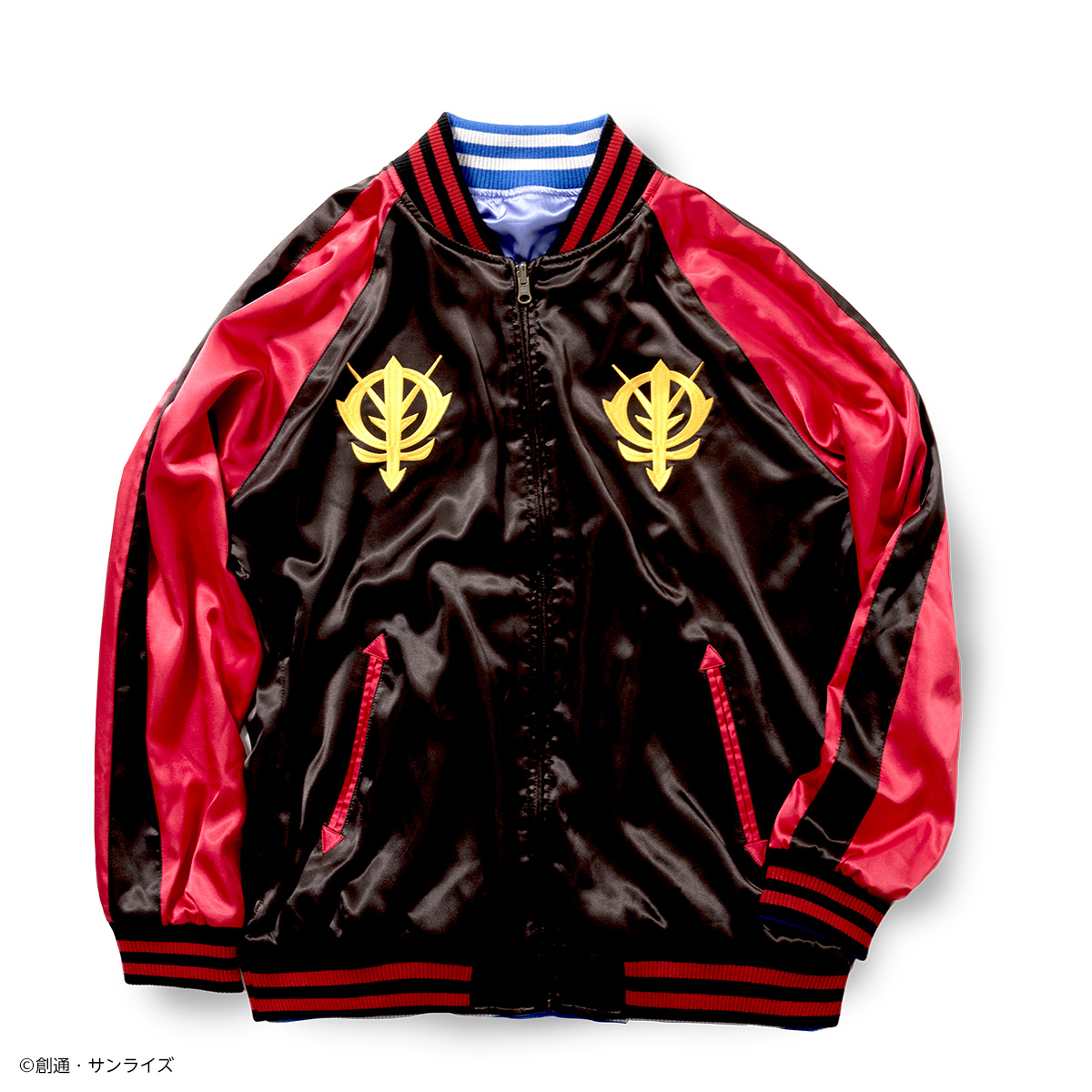 外層為黑底配紅色刺繡,胸前佩有兩個「吉翁公國軍」徽章,背面則大面積繡上紅色鋼彈的霸氣姿態。內層以角色「修司伊藤」的造型色為靈感,搭配簡單文字刺繡,上面也配有作品年代宇宙世紀0085年的字樣。