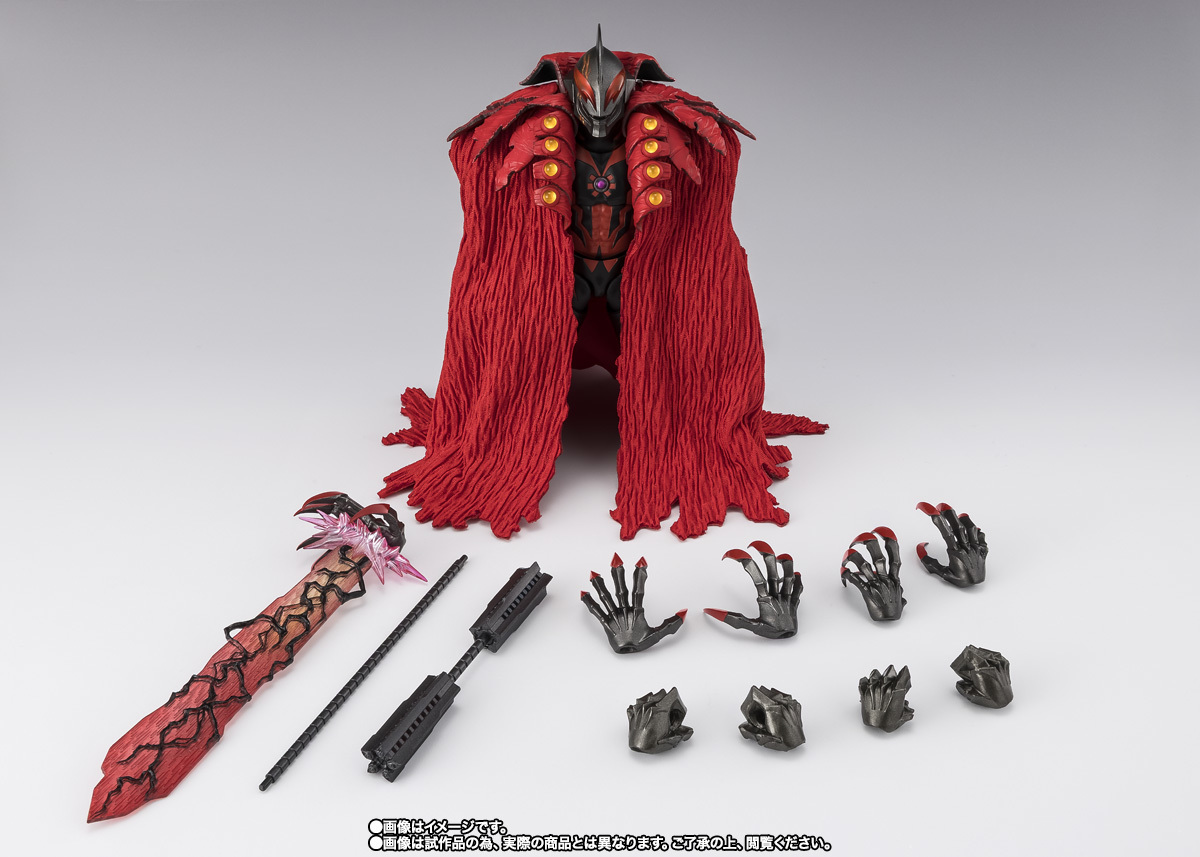 「S.H.Figuarts 凱薩貝利亞」由圓谷製作造型部門 LSS 協助監修,在全高 15 公分尺寸下忠實還原劇中形象,塑造出貝利亞極為兇惡的頭部造型、雙手的巨大利爪,並施以色彩塗裝再現頭部的金屬質感、疤痕。而作為銀河帝國皇帝象徵的巨大「披風」,則以領口周圍的塑膠零件、垂下的三片布料零件構成,布料不僅重現了特徵的皺摺紋路、不規則的鋸齒邊緣,也能使用內藏的金屬線調整造型,配合本體動作把玩帥氣姿勢。