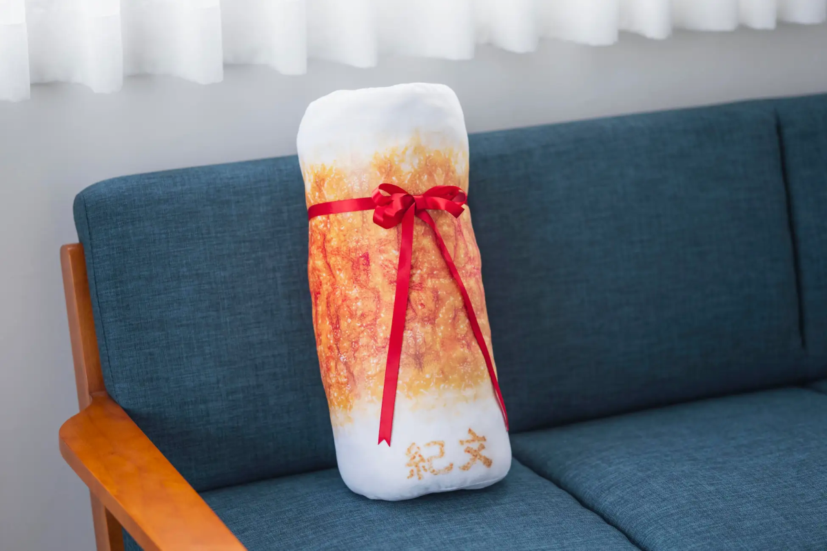 這款由紀文食品與日本出版社ワニブックス聯手推出,以紀文長年熱銷 52 年的經典商品「竹輪」為原型製作,尺寸相當於約 40 根竹輪的超豪華加大版,大小約50cm × 20cm。還附贈一本介紹竹輪小知識與員工私藏食譜的小冊子。