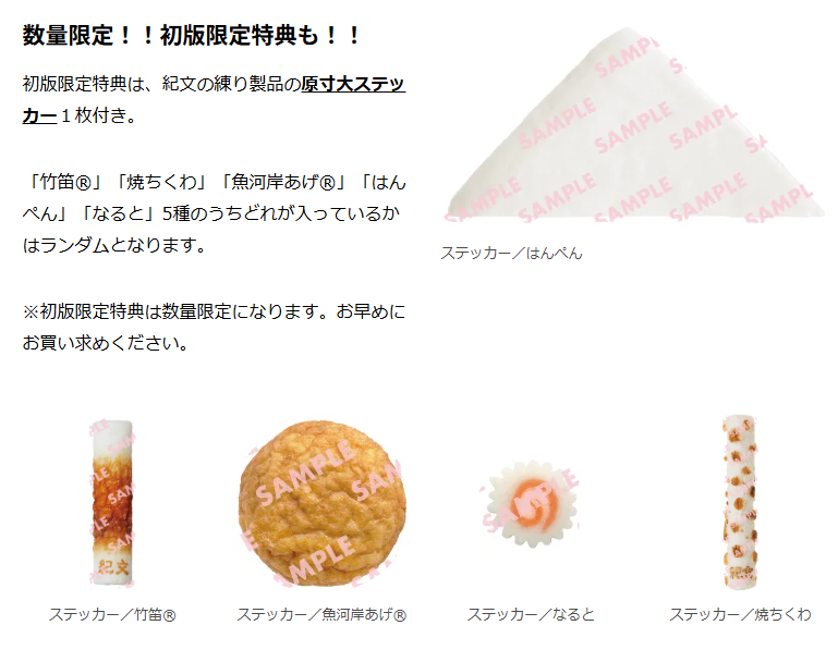 此外,初版限定還會附一張「紀文魚漿製品」原尺寸貼紙!共有五種款式:「竹笛®」、「烤竹輪」、「魚河岸揚®」、「魚板」、「鳴門」,隨機附贈一款。