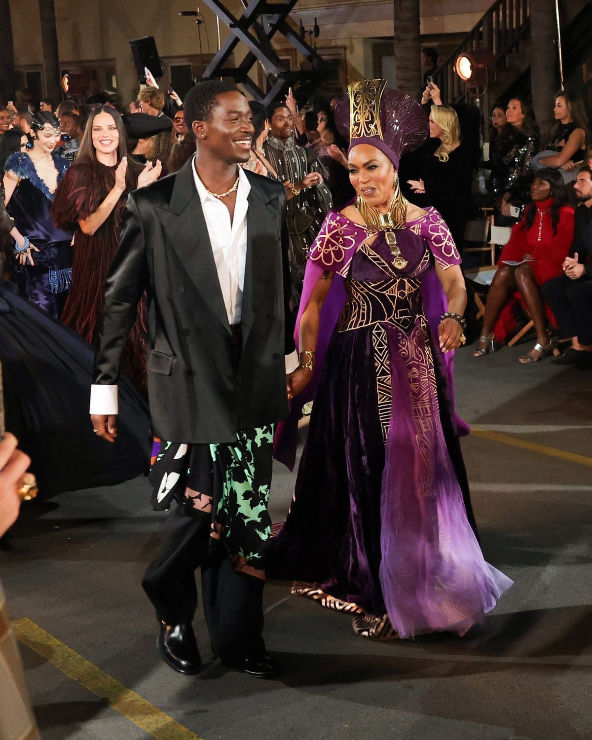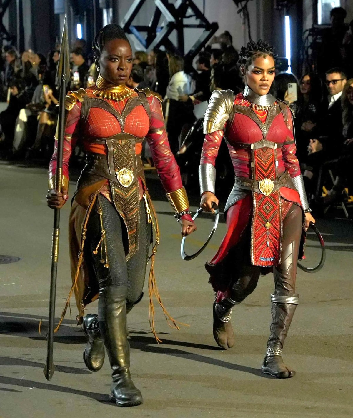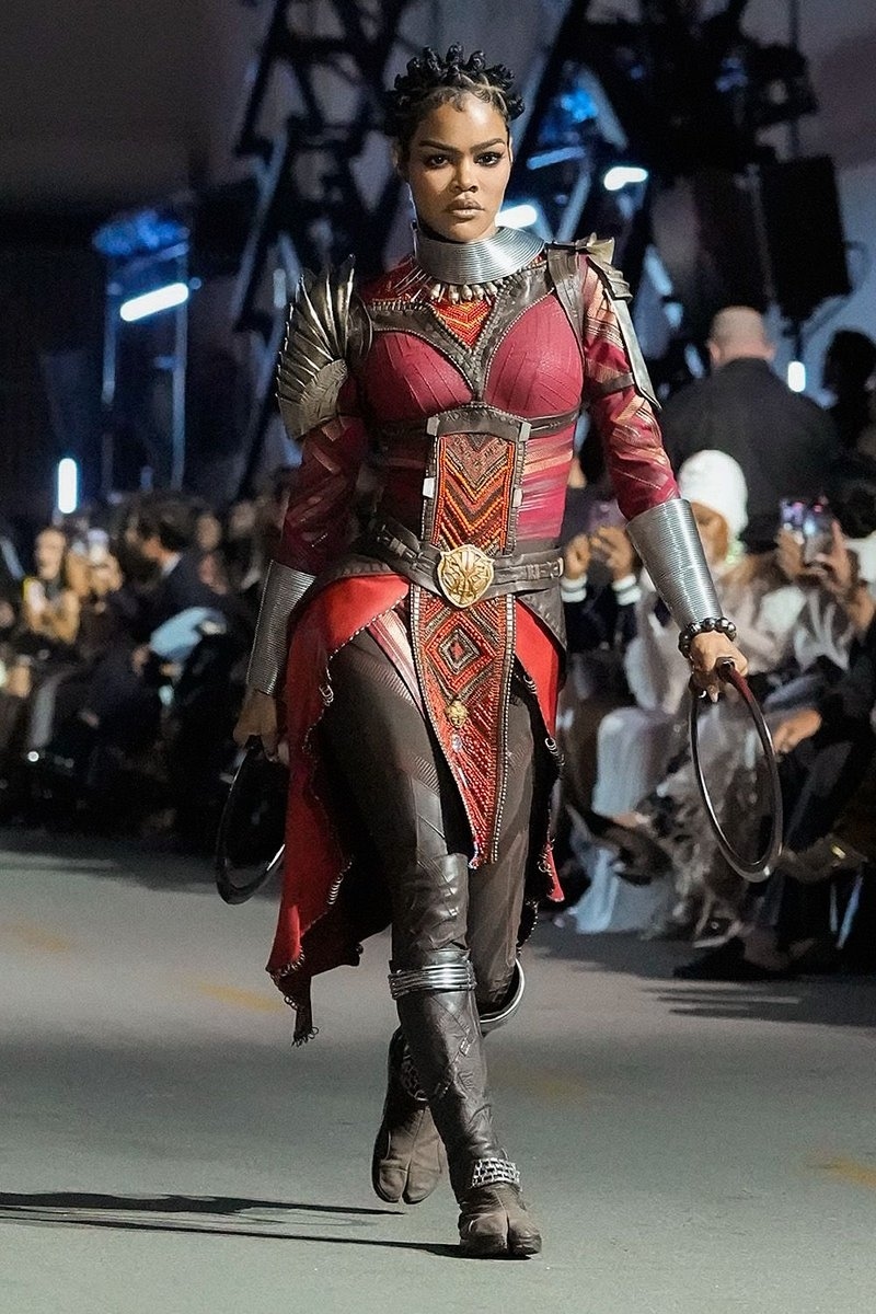 其中,直接身穿《黑豹》(Black Panther)原裝戲服走秀的人馬最為吸睛,因為著裝出場的,就是來自《黑豹》系列卡司群的瓦干達侍衛長「奧柯耶」黛娜葛里拉(Danai Gurira)、以及瓦干達皇后「拉瑪達」安琪拉貝瑟(Angela Bassett)。另外,就連最近在《一戰再戰》(One Battle After Another)飾演李奧納多狄卡皮歐(Leonardo DiCaprio)革命軍領袖妻子的歌手-提亞娜泰勒(Teyana Taylor,下圖右),也有穿上「朵拉親衛隊」的制服陪同走秀。