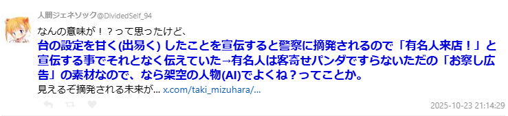 這種「AI 美少女代替名人來店」的創意企劃一度在 2024 年底到 2025 年初流行,但很快引來政府注意。