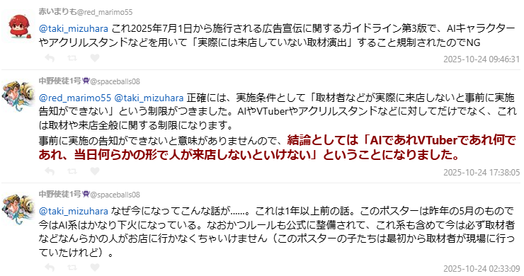 現在其實依據 2025 年 7 月 1 日正式上路的《廣告宣傳指引》第三版,業者已被明令禁止使用 AI 角色、VTuber或壓克力立牌 來進行「實際沒到現場卻假裝來店」的宣傳。