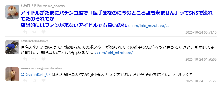 消息曝光後,許多日本網友紛紛留言表示「終於解謎」:「我以前一直搞不懂為什麼柏青哥店老愛請不知名的人來,原來那是出獎暗號啊。」、「難怪有些偶像抱怨現場沒人來握手會,店家根本不在乎有沒粉絲,只要能貼上『有名人來』那四個字就好。」、「店家以為用 AI 就能省錢,結果被政府搶先一步擋下,笑死。」