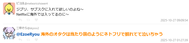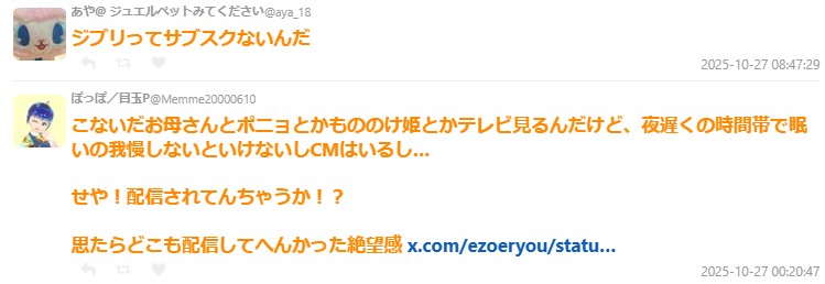 不少網友回應表示,吉卜力作品在日本並未上架任何串流平台(如 Netflix 或 Amazon Prime Video),導致觀賞門檻極高。有網友就表示:「前陣子想和媽媽一起看《神隱少女》和《魔法公主》,結果查了一圈發現哪裡都沒有上架,那種絕望感真的很重。」