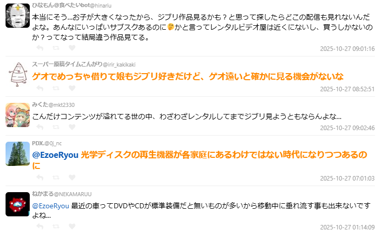 引起討論的推主表示,現在日本三種僅存的能收看吉卜力作品的方式:「等電視台播出」、「購買光碟」或「去租光碟」而已,現在光碟幾乎已經是絕種物品,並感嘆「現在的小孩根本很難看到吉卜力作品了」。