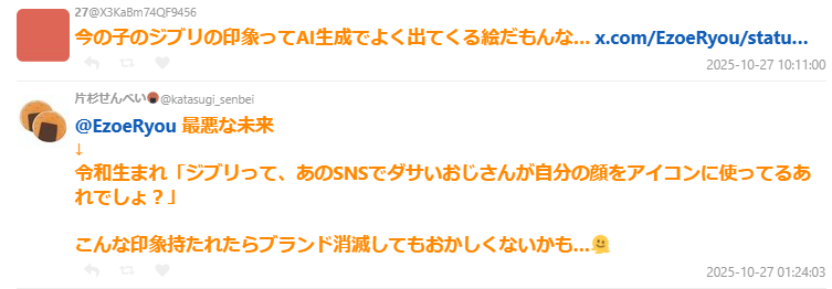 更有網友感嘆:「現在的小孩對吉卜力的印象,最糟就是變成那種老人在社群上用 AI 生成圖的那種風格……」,真的會讓人崩潰。
