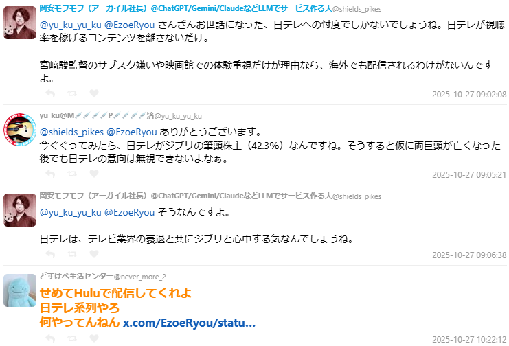 其實《吉卜力》的最大股東是日本電視台(NTV),所以網友推測,日テレ為了守住收視率,不願放手讓作品上架串流平台。讓這個IP現在就成為這樣很奇怪的現象,在日本不開放,在海外卻又公開。