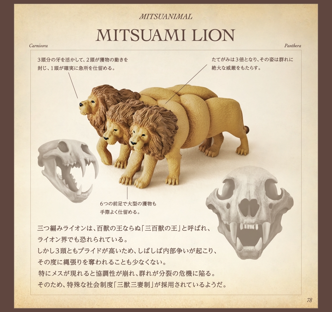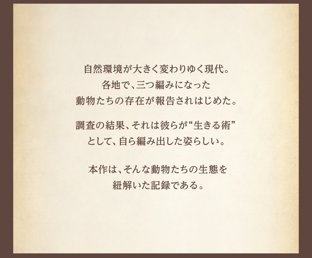 在自然環境發生巨變的現今,各地紛紛傳出「發現編成三股辮樣貌動物」的奇異報告,經過調查之後發現,這些神秘新物種自行「編織」而成的姿態似乎是為了適應新環境的生存之術......。本作正是基於這個有趣的設定,將調查報告中的奇異動物們立體化!而品名三股辮動物(三つ編ニマル / mitsuanimal)則是「三つ編み」與「アニマル」的結合。