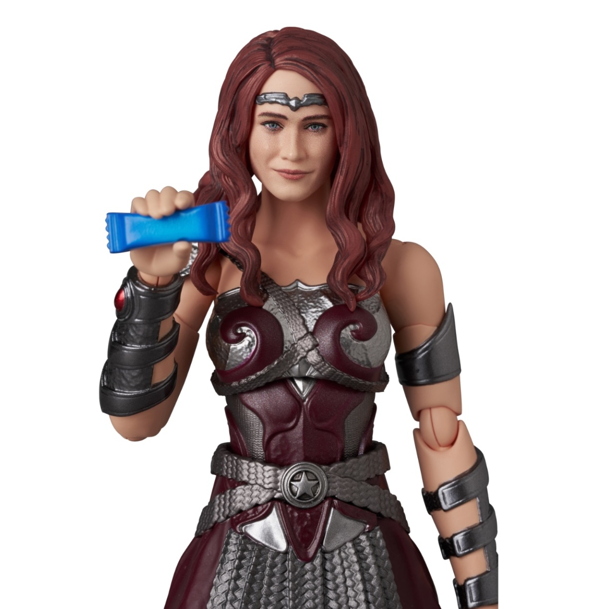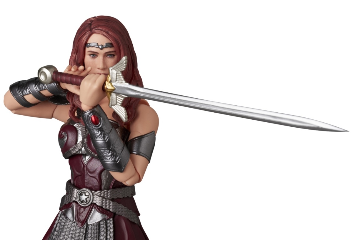 本次的 MAFEX 梅芙女王高約 15.5 公分,由大畠雅人 & PERFECT-STUDIO 擔任原型製作,在小尺寸下呈現演員多明妮克·麥克艾麗戈特(Dominique McElligott)標誌的五官特徵,細膩的重現參考神力女超人造型打造的戰衣,頭髮部分以雕刻方式還原劇中蓬鬆的長捲髮,應該多少會限制到頭部的可動範圍。配件部分收錄有兩款表情的替換頭雕、多組替換手、武器長劍以及沃特推出的勇敢梅芙驕傲能量棒(Brave Maeve Pride Bar),能夠配合靈活可動與先前推出的護國超人、膏鐵俠等其他角色一起擺設再現各種場景!