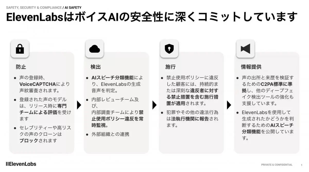ElevenLabs以嚴格的安全體系著稱,其核心「VoiceCAPTCHA」可透過聲紋驗證確保音源真偽,而全新導入的「C2PA」則由Adobe、Microsoft與Google等巨頭共同推動,為數位內容附上具防竄改功能的電子憑證(Content Credentials),清楚記錄內容生成與修改的歷程。