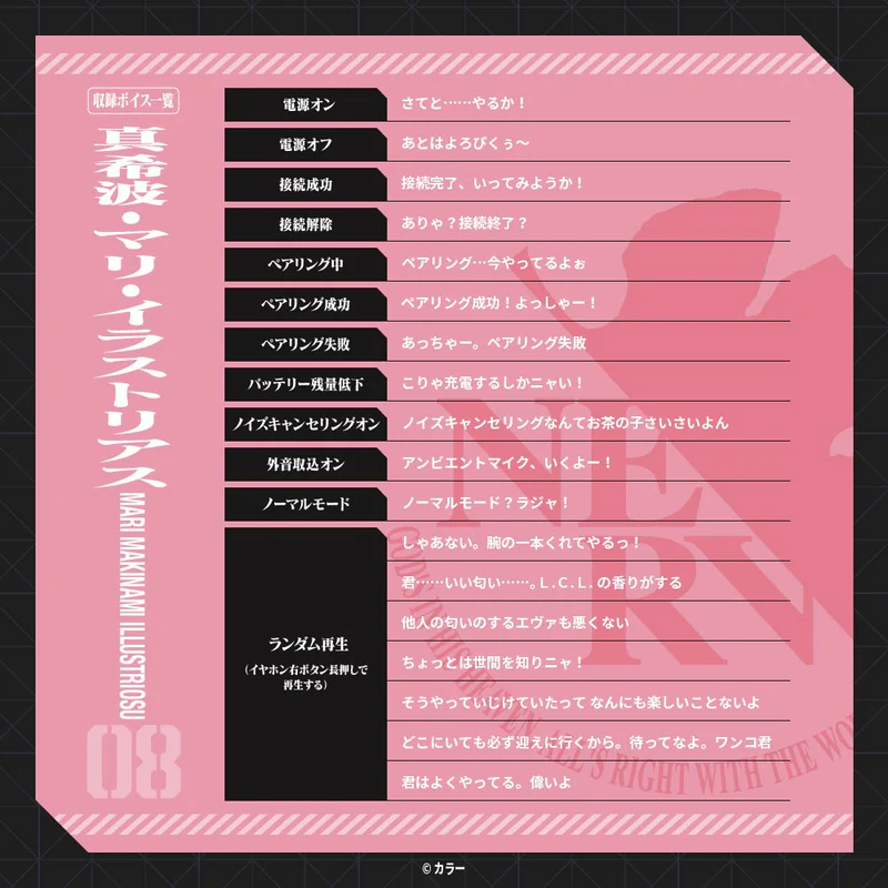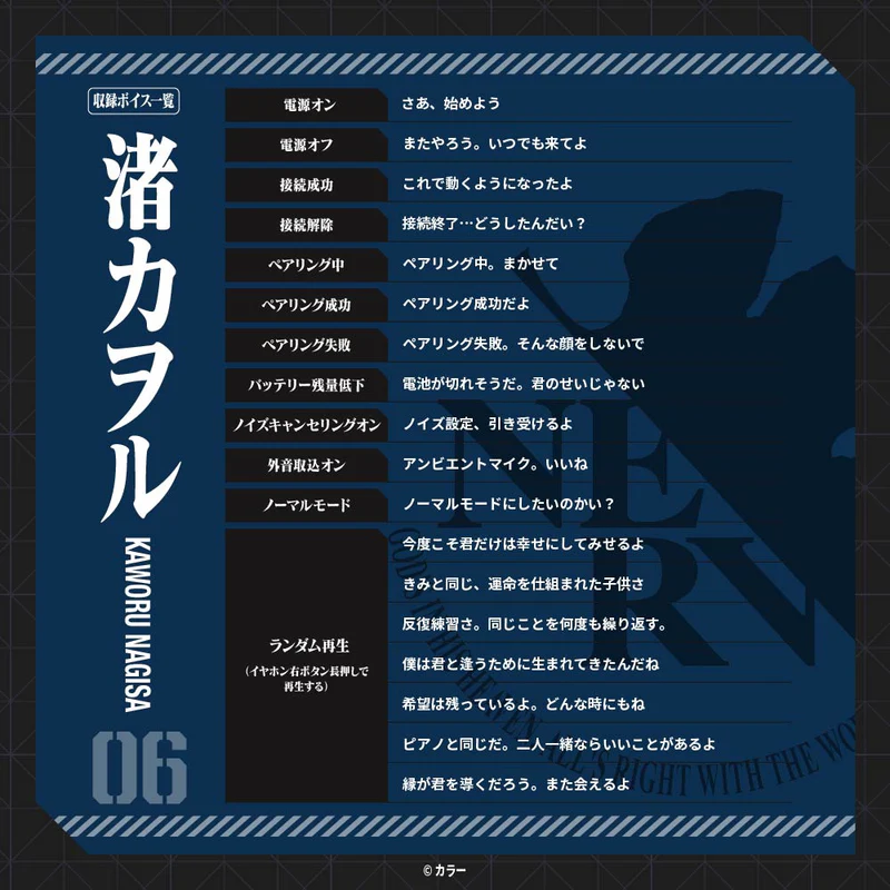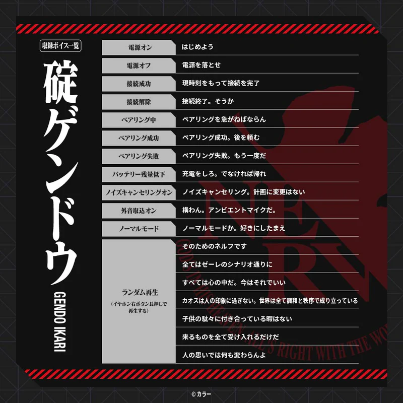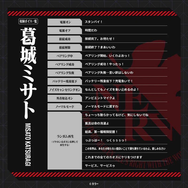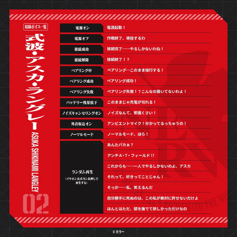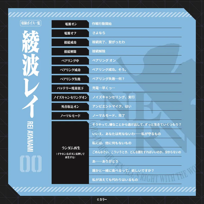 支援角色包括:碇真嗣、綾波零、明日香、真希波、葛城美里、赤木律子、渚薰、碇源堂、加持良。。總共9種語音模式,還可以使用AVIOT專屬App就能一鍵切換。