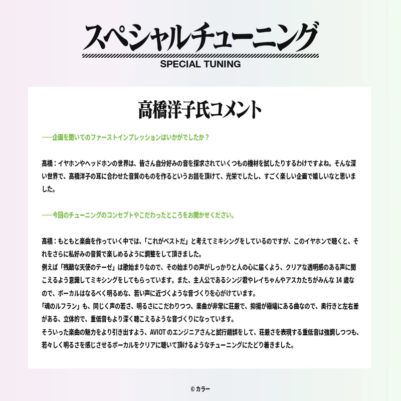 此外這款耳機的音質調校由《新世紀福音戰士》主題曲演唱歌手──高橋洋子親自參與監製。她提到:「能在耳機這樣講究音質的領域裡,用我自己的耳朵去調出理想的聲音,是件非常榮幸又有趣的事。」