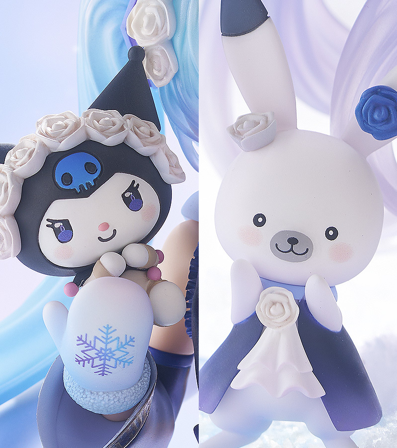 GSC「雪未來×酷洛米」1/7比例模型,採用繪師PiPi為 2022 年北海道「SNOW MIKU×KUROMI HOKKAIDO」所繪製的三麗鷗聯名「雪未來×酷洛米」插畫為基礎,將這超可愛的人氣組合立體化!尺寸約高 22 公分,透過透明零件還原雪未來帶有輕盈感的標誌性雙馬尾,搭配珠光與漸層色調,營造夢幻氛圍;聯名設計服裝的珍珠塗裝會隨著光線角度呈現不同的色澤,多層次的蓬蓬裙與圍巾增添俏皮氣息~手上抱著愛搗蛋的酷洛米,還有腳邊的蝦夷雪兔小寵物「Rabbit Yukine」都有成對的白玫瑰配件,超級可愛!