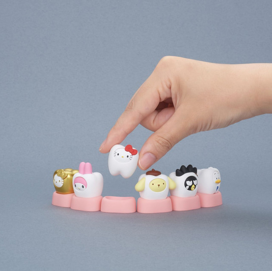 可愛討喜的三麗鷗明星們變身成一顆顆潔白的牙齒!從目前公開的官圖&資料可以得知,每一款三麗鷗明星牙齒約有 3.5 公分的高度,除了展現出戴上牙齒頭套的造型之外,腿部....或應該說是根部也做出了牙根的造型,加上彷彿牙齦一般的粉色底座就可以排列展示,拿起來放在手上肯定也超可愛!