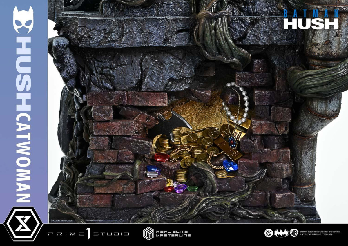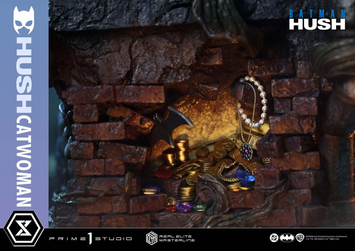 本作高約 65 公分,打造出貓女「瑟琳娜·凱爾」站立於高譚市建築屋頂的身影,整體忠實還原了 Jim Lee 筆下的細緻畫風,同時保有《緘默》的世界觀元素,並以高超製作工藝盡可能傳達出寫實的質感。透藍鏡片的護目鏡、白皙肌膚與水潤紅唇、展現漂亮光澤的緊身衣,以及凹凸有致的性感身形線條,全部都是這款貓女的看點!底座除了有黑貓之外,更能在破損的磚牆內發現大量金銀財寶,仔細看還能找到一枚蝙蝠飛鏢。