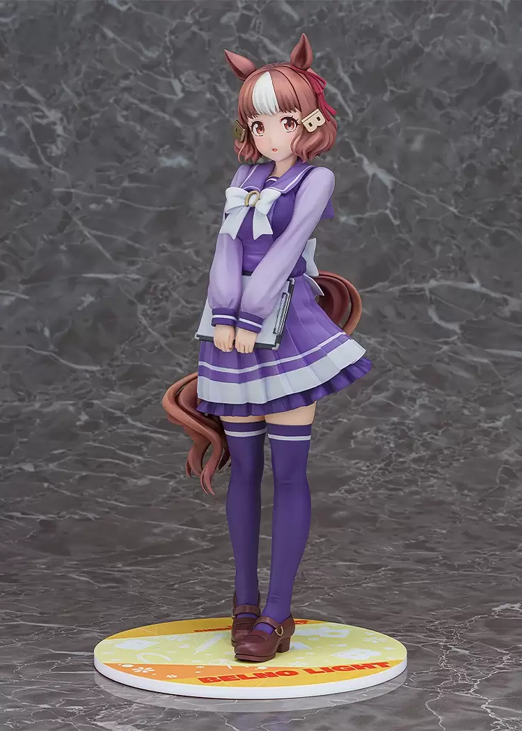 「雙鈴萊特 1/7比例模型」將她身穿特雷森學園制服、雙手抱著資料夾板的模樣立體化,重現原作中水汪汪的大眼睛、柔軟捲曲的短髮、特色的「B」字髮夾。貼著身軀的尾巴、微微收起的下頷等細節,則展現出她溫厚篤實、有些內向的可愛性格。同時模型針對頭髮、制服等多處施以細膩的陰影、漸層塗裝,讓髮束、皺摺細節更加立體。而底座則融入雙鈴萊特的形象設計,印有B字髮夾、緞帶、蹄鐵等豐富圖樣。