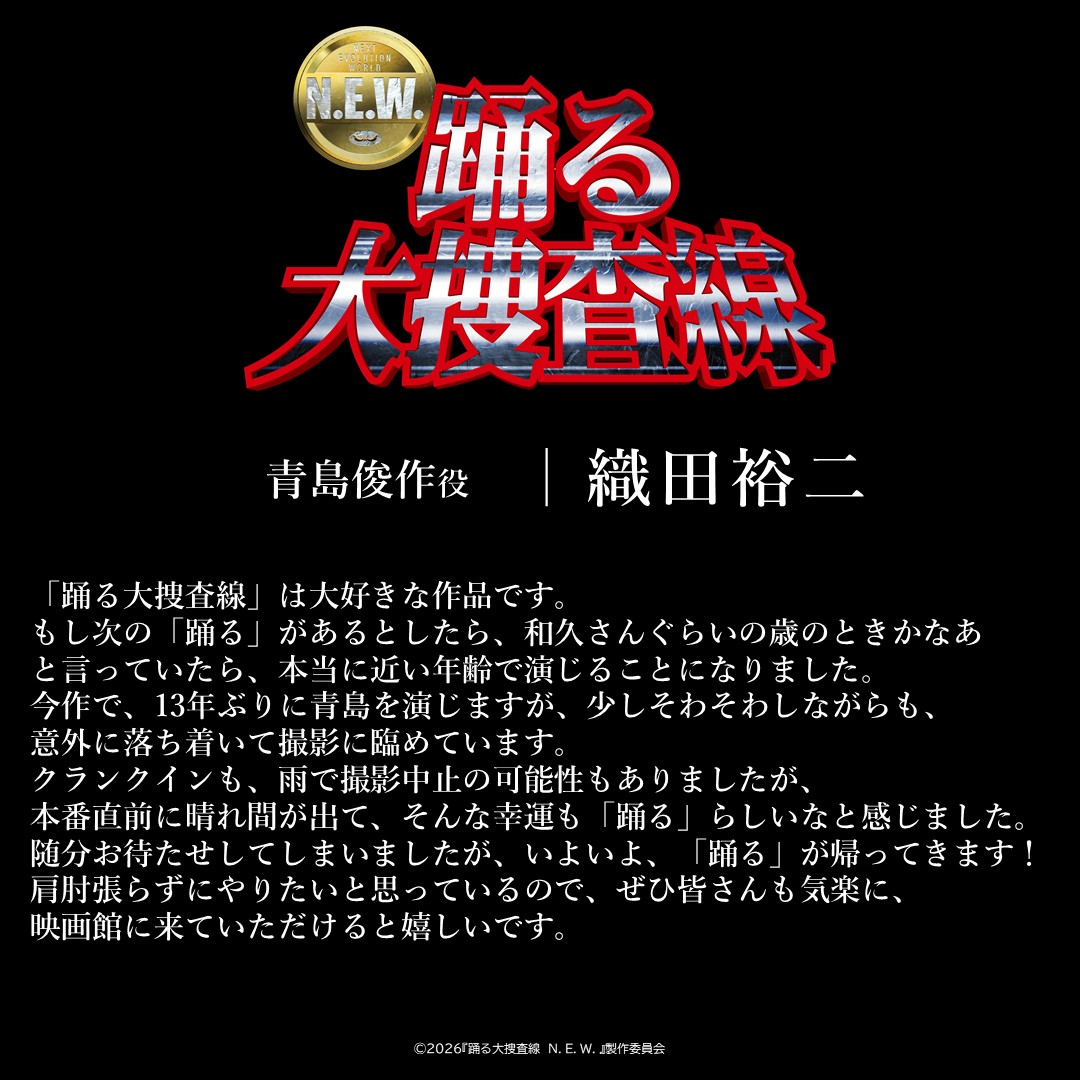 織田表示:「雖然隔了13年再次演出青島,心裡難免有點緊張,但意外地也能很冷靜地投入拍攝。」他同時開心地說:「真的讓大家久等了,《大搜查線》終於要回來了!」,希望粉絲期待屆時登上大銀幕。