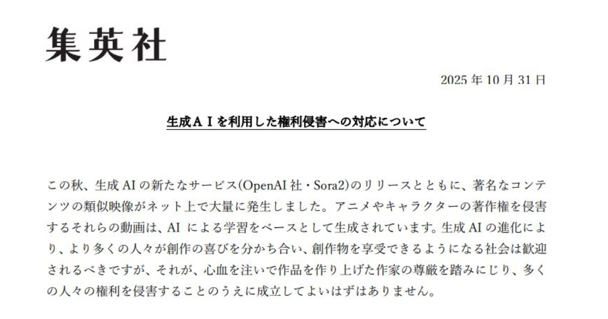 日本漫畫出版社大廠集英社在10月31日發表聲明,正式針對生成式 AI 所造成的著作權侵害問題表達立場,並強調將「嚴正處理一切侵權行為」,希望各位使用AI時能夠注意相關規範。