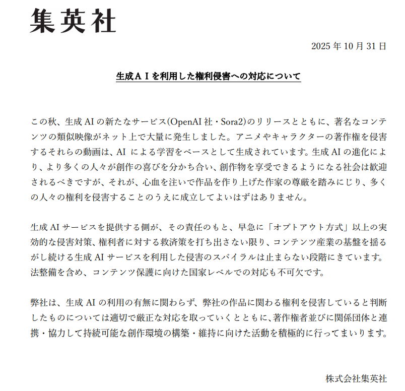 集英社在聲明中嚴厲指出,這些影片「是以 AI 學習為基礎生成的產物」,等同於「踐踏創作者努力與尊嚴」的行為,對此表達強烈憂慮。雖然公司也承認「生成式 AI 帶來的創作可能性應被正面看待」,但明確強調「建立在侵權上的創作行為絕對不可被容許」。