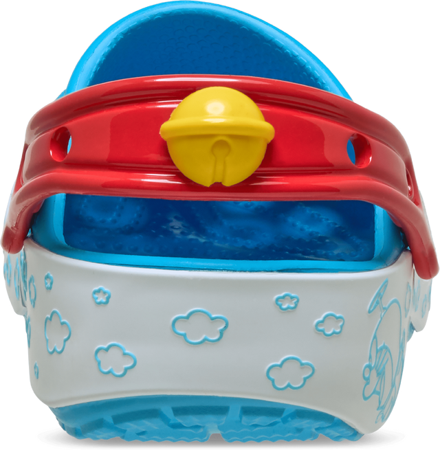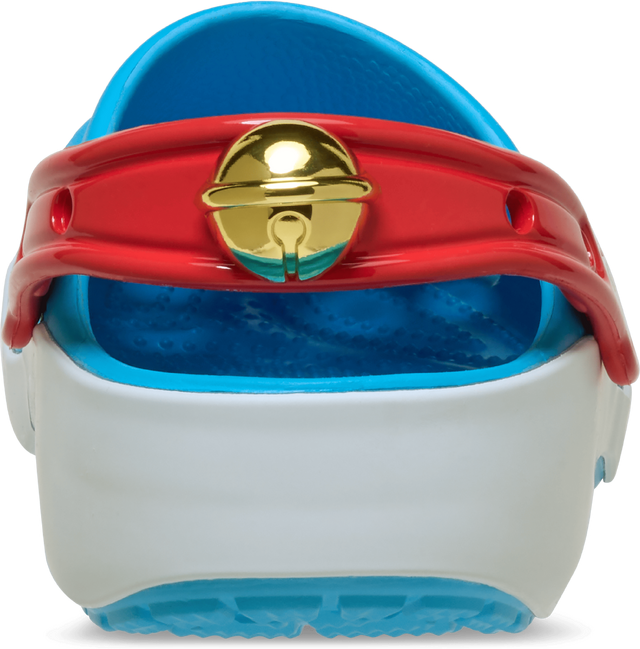 這次是能讓粉絲「穿在腳上的哆啦A夢」,結合經典造型與 Crocs 標誌性造型的特別收藏。鞋身採用哆啦A夢代表性的亮藍色,搭配象徵項圈的紅色後帶,鞋跟位置還還原了哆啦A夢招牌的金色鈴鐺設計。