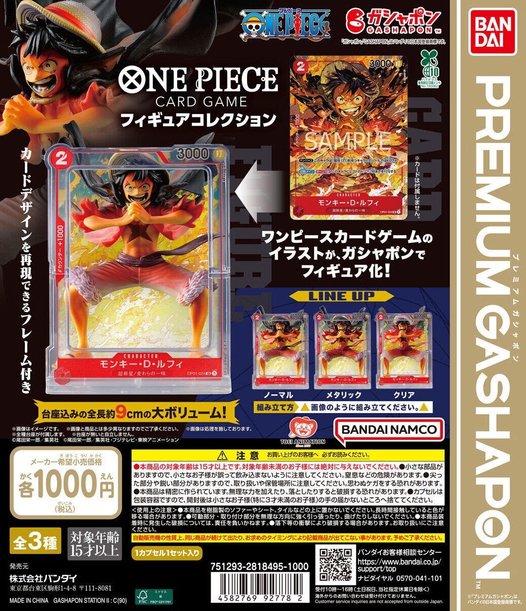 「ONE PIECE CARD GAME 人物收藏」轉蛋,以航海王卡牌遊戲 OPTCG 的卡牌插畫為基礎,將補充包ROMANCE DAWNSR的魯夫異圖卡中充滿氣勢的造型立體化,在,在 GASHAPON 史上最大規格的 90mm 尺寸轉蛋登場~收錄有普通版、金屬版、透明版三種配色的魯夫,採用透明框還原卡牌上的數值和文字,背板也印刷出熊熊烈火的背景~