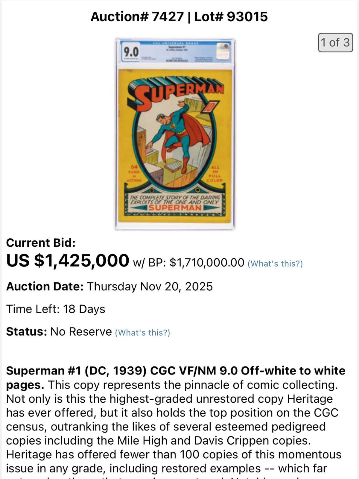這本漫畫即將於2025年11月20日至22日登上Heritage Auctions的「Comic Books Signature®」拍賣會。拍賣行表示,它或將挑戰「史上最貴漫畫」的寶座。目前紀錄由2024年拍出的《Action Comics #1》CGC 8.5保持,成交價高達600萬美元;而《Superman #1》上一個高價成交版本(CGC 8.0)則在2022年以530萬美元 易主。