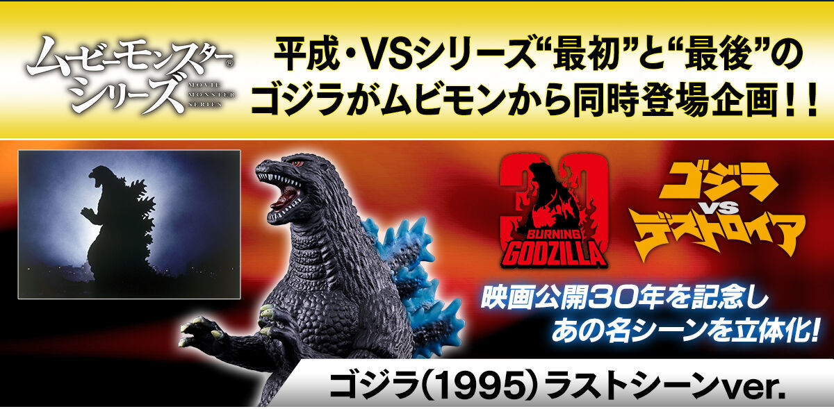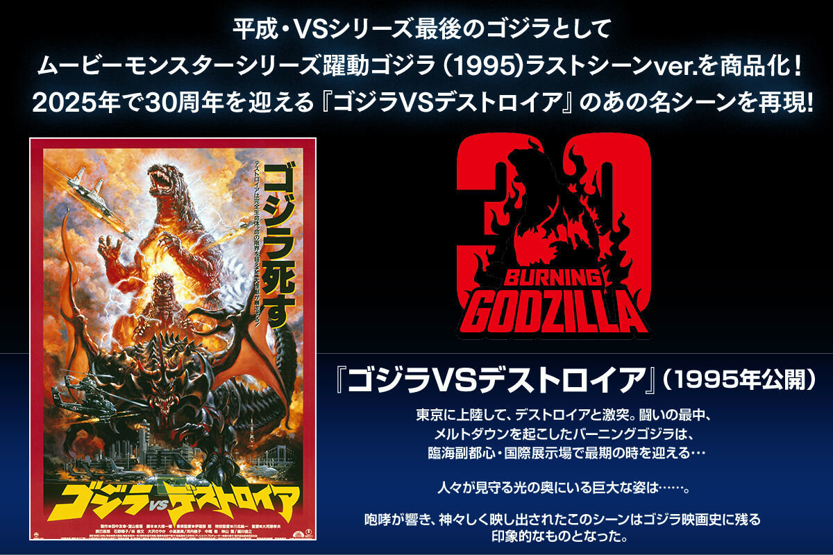 「MOVIE MONSTER 躍動」系列,採用了更豐富的姿勢變化,透過逼真的造型和精湛的塗裝,將劇中的怪獸栩栩如生地呈現。本次推出代表平成VS系列最後一部電影《哥吉拉vs戴斯特洛伊亞》商品「MOVIE MONSTER 躍動 哥吉拉(1995)終幕ver.」怪獸軟膠,尺寸約高17公分,不僅刻畫出標誌性的厚實胸肌和粗壯的腿部線條,也還原了充滿力量的咆哮之姿!為呈現出最終幕的形象,背鰭採用漸層淺藍色塗裝,精心再現了在逆光中透光的效果。