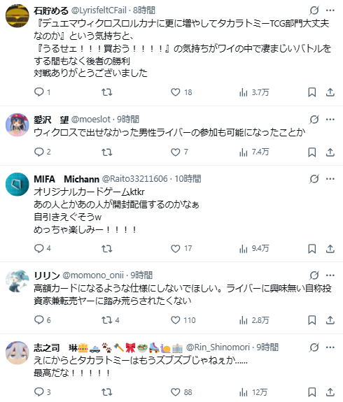 因此消息一出,粉絲紛紛留言表示興奮:「這下要跟《Hololive TCG》和《Xross Stars》變成三方戰場啦!、「彩虹社這波氣勢感覺來勢洶洶欸!」「雖然還要很久,但感覺官方這企劃的安排應該很謹慎且用心」。