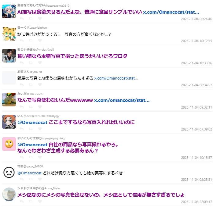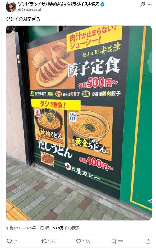 日本近日X對此掀起一波討論,因為有推主分享一間餐廳疑似使用 AI 生成的「餐點宣傳圖」,這樣的安排不僅詭異,還被網友戲稱為「阿北的AI」(ジジイのAI),引發大量共鳴熱議。