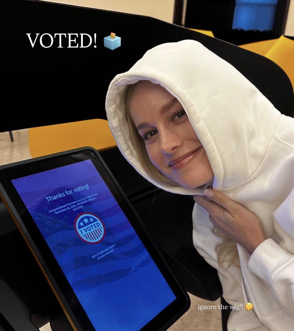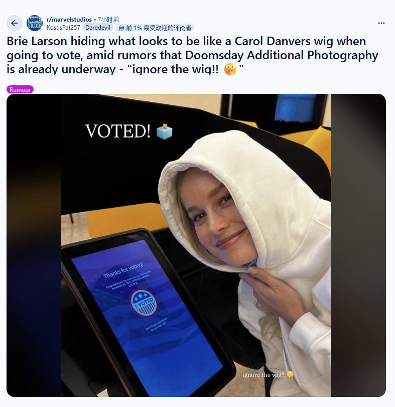 拉森在限時動態中表示自己已完成投票,畫面中她身穿寬鬆連帽衛衣,將帽子拉起遮住身體與頭髮,只露出一小撮金色假髮。乍看之下平凡無奇,但「別在意假髮」的標題立刻引發粉絲關注。這句話被認為過於刻意,尤其對一向以金髮造型示人的《驚奇隊長》(Captain Marvel)女星來說,更顯得耐人尋味。