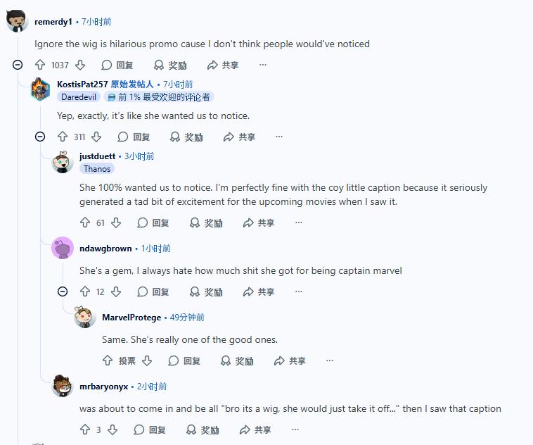 不少漫威迷推測,拉森此舉是在刻意掩飾新角色造型,暗示她其實正在拍攝尚未公開的補拍畫面。由於她並未出現在《復仇者聯盟:末日之戰》的首波主卡司名單中,粉絲認為這可能是漫威為保密而採取的「隱藏演員」策略。