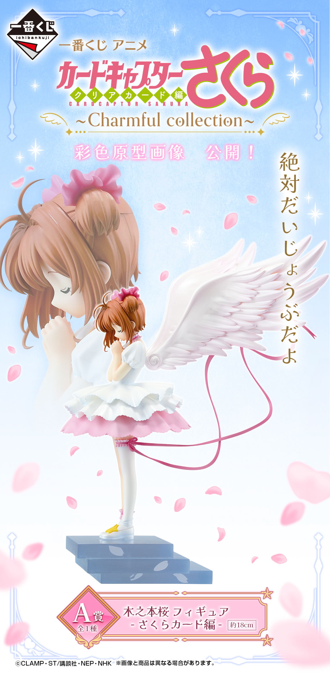 本次的「庫洛魔法使 透明牌篇~Charmful collection~」將以透明牌篇為主軸提供 A~H、最後一賞與雙重中獎賞等不同級別的賞品,目前搶先公開了 A 賞與最後一賞的角色模型!其中 A 賞為「木之本櫻 小櫻牌篇」,採用小櫻牌篇 OP3〈プラチナ〉中的造型,製作出她將雙手抱在胸口祈禱的動態,細膩的雕刻還原蓬蓬裙與翅膀的造型細節,飄逸的緞帶爲整體增添了強烈的動態感!而最後一賞則為 A 賞的最後一賞 Ver.,改為製作了小櫻轉頭看向鏡頭的姿態,提供不同於 A 賞的視覺效果!