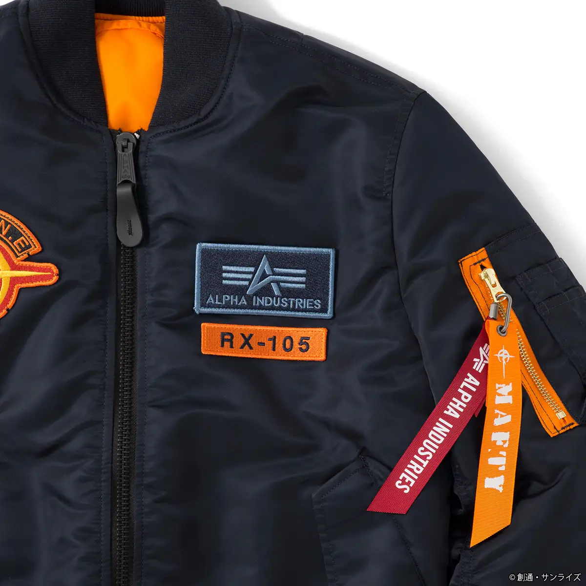 外套主色採用深海軍藍主體搭配搶眼的橘色內裡,右胸配置「馬法提」徽章,右臂則是以「Ξ鋼彈」為主題的刺繡臂章,背面還有羊皮皮革的「馬法提」標誌,整體設計充滿存在感與收藏價值。