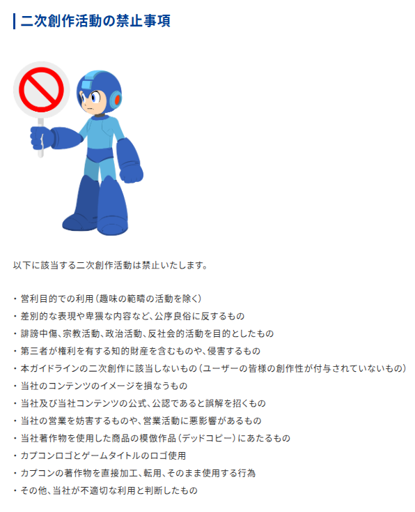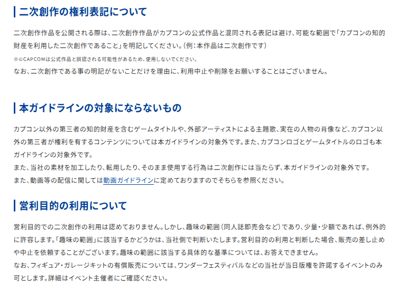 大家最關心的營利利用部分,卡普空給出的態度是「原則上不可做為營利用途」,但有一個很重要的例外──只要是在同人活動範圍內的少量少額販售(例如同人誌即賣會)且屬於興趣嗜好範圍,卡普空會例外容許。