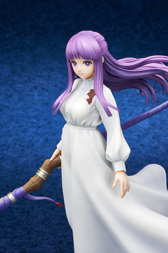 「quesQ 費倫~對琉古納戰~」1/7比例模型,尺寸約高 24.5 公分,以劇中與琉古納的對戰場景為靈感,將戰鬥時脫下染血的黑色外袍脫的凜然姿態立體化!露出與平時不同的冷峻的表情,給人強大力量的壓迫感;白色連身裙凸顯了豐滿的上身,裙擺與髮絲都動感地飄揚!法杖與銀色的髮飾野精緻刻劃,相當精采~