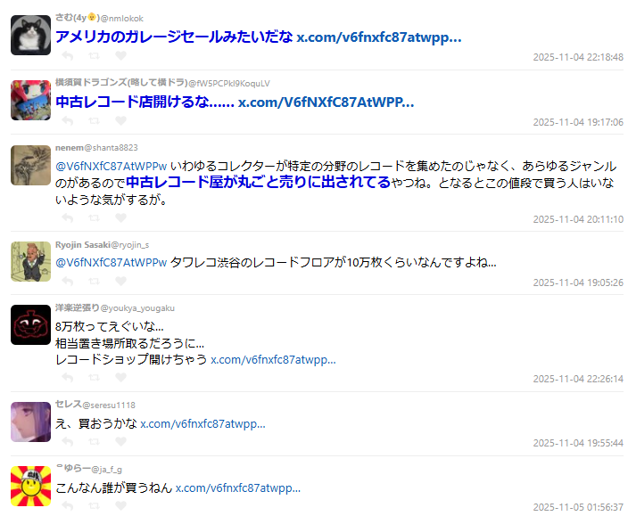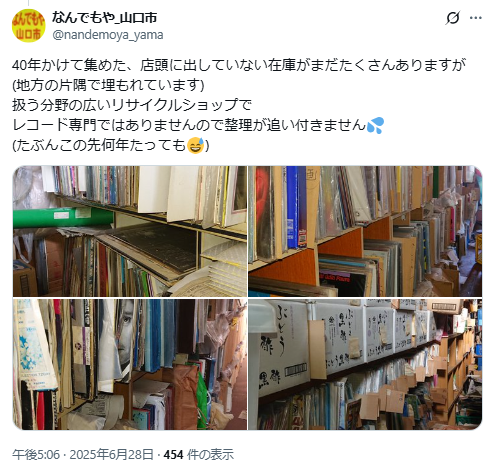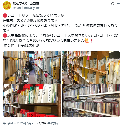 然而後續網友發現,這間位於山口市的二手店「なんでもや」,店主在六月時就已經發文表示,這些唱片是自己花了40年時間蒐集而成,包含 LP、EP、SP、CD、LD、VHS、卡帶等各種媒體,總數約8萬張。他也提到,因為年事已高、店內空間有限,希望能一次轉讓給想開唱片店的人:「包含庫存在內全部打包800萬日圓,運送與作業費可再商量。」