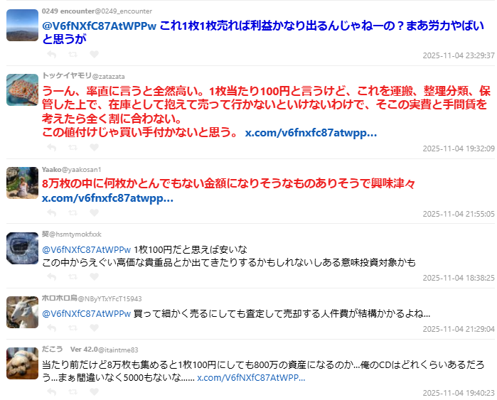 也有網友開始計算這筆生意的可能性:「800萬÷8萬張,一張100日圓,看起來不貴啊!」、「如果一張一張賣說不定能賺回來。」但也有人潑冷水:「運送、分類、上架、保存……光人力成本就爆炸了,這價格其實一點都不便宜。」