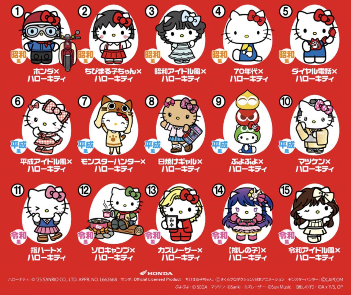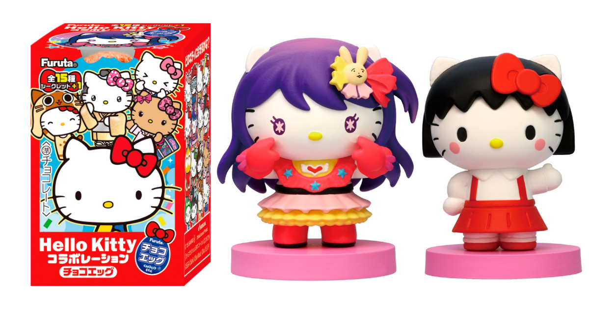 「古田巧克蛋 Hello Kitty」將隨蛋收錄一款 Hello Kitty 的迷你角色模型,本次系列以昭和、平成、令和三個時代為主題,為 Hello Kitty 打造了三個時代各五種和一款隱藏版共 16 種款式的造型!昭和主題收錄 Honda、櫻桃小丸子、昭和偶像、70 年代以及旋轉式電話;平成主題收錄平成偶像、魔物獵人、日燒辣妹、魔法氣泡、松平健;令和主題則收錄了手指愛心、單人露營、卡蘇萊薩、【我推的孩子】以及平成偶像,精緻的展現各個時代的風潮與特色,讓 Hello Kitty 的裝扮紀錄近百年的文化與流行脈絡,也展現了 Hello Kitty 歷久彌新的可愛魅力!