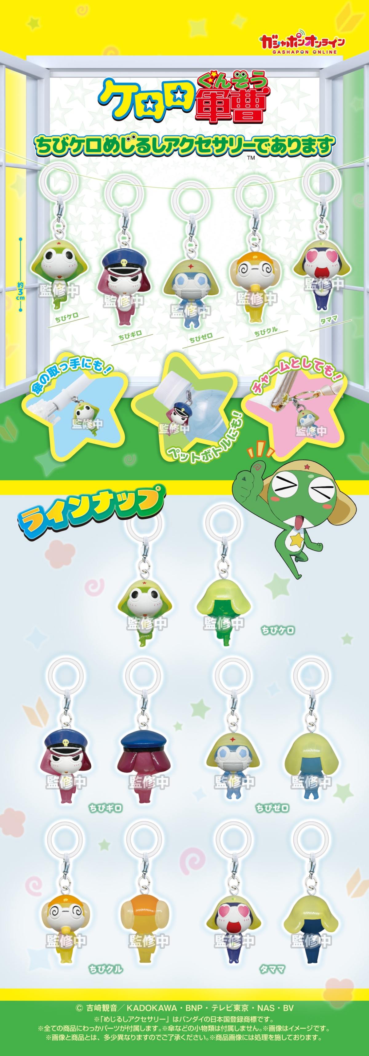 GASHAPON的標記吊飾系列在吊飾上附有橡皮環,可以將吊飾套在雨傘之類的物品上做標記,就不怕拿錯了!繼先前的「Keroro軍曹 標記吊飾是也!」和「Keroro軍曹 標記吊飾 ~動物變身是也!~」後,本次的「Keroro軍曹 迷你青蛙標記吊飾是也」將 Keroro 小隊成員們的幼年造型製作為高約 3 公分的角色模型,並為角色們打造了符合各自性格的造型與動態,收錄 Keroro 軍曹、Tamama 二等兵、Giroro 伍長、Kururu 曹長以及 Dororo 兵長五種款式,不管是愛心眼睛的 Tamama 還是快哭出來的 Dororo 都超級可愛!喜歡《Keroro軍曹》的各位玩具人千萬不要錯過!