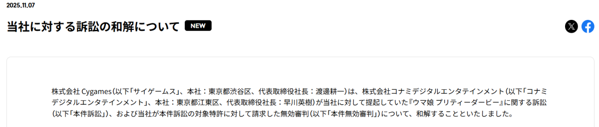 Cygames在 11 月 7 日宣布,已與KONAMI就《賽馬娘 Pretty Derby》相關的專利訴訟,以及針對該訴訟所涉及專利提出的無效審判正式達成和解,讓兩年前的法律戰正式落幕。