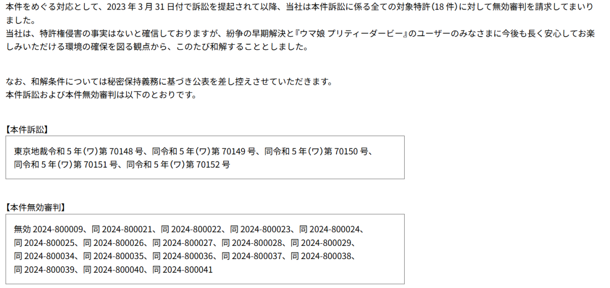 Cygames 表示:「我們始終確信《賽馬娘 Pretty Derby》並沒有侵犯任何專利權。不過,基於希望能盡快化解爭端,並讓《賽馬娘 Pretty Derby》的玩家能繼續安心長久地享受遊戲的立場,我們決定與對方達成和解。至於具體的和解條件,因雙方簽有保密協定,因此不便公開。」