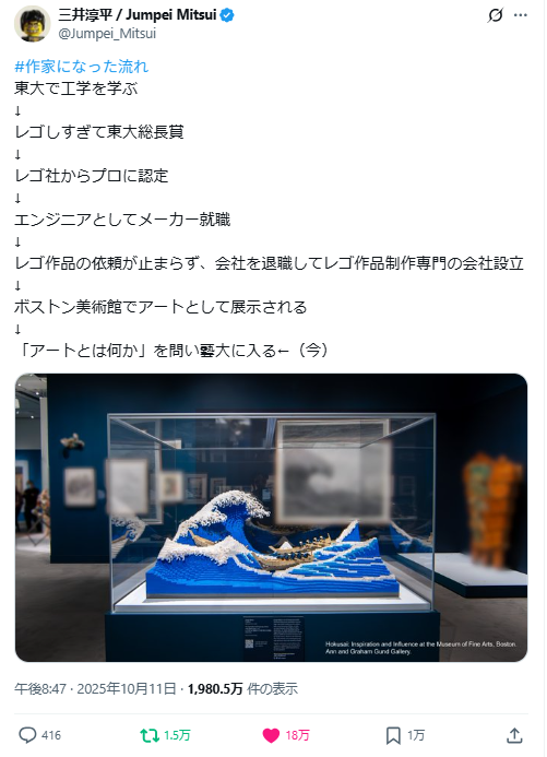 這次,他搭配熱門標籤「#成為作家的契機」,分享了自己一路走來的經歷與代表作。三井從小就愛上樂高,之後進入東京大學工學系就讀。他不但創立了「東大樂高社」,還因作品表現優異獲得「東大總長(校長)獎」。