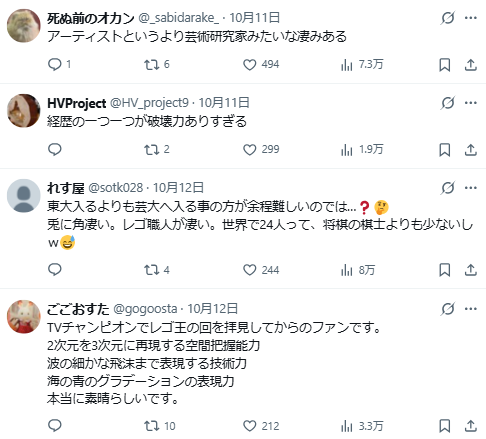 網友們看完他的故事後完全傻眼:「從創作者變成藝術研究家真的太強大了」、「到底有什麼做不到的事」、「考到東大後來又考上藝大研究所,還是個世界僅24人的樂高認證達人,真的太罕見了...」、「這人根本傳奇,沒有嫉妒的空間,只剩佩服。」