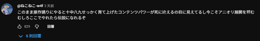 也有網友表示:「照現在這樣按照原作走下去的話,十之八九好不容易培養起來的作品熱度就要毀光光了。所以現在正是拜託動畫組展開原創劇情的時候啊反過來說,如果能做到的話,有機會成為傳說級的存在。」