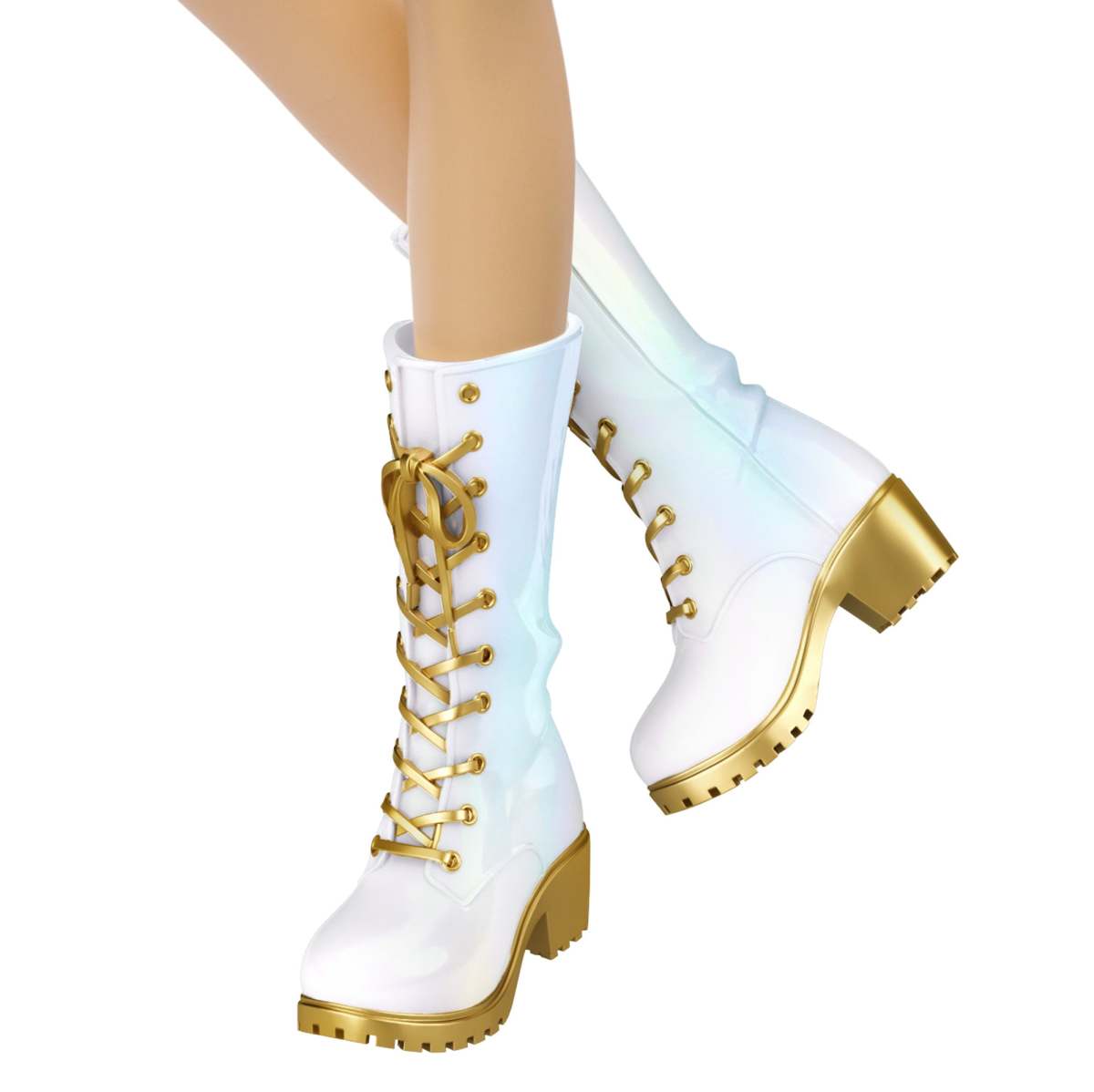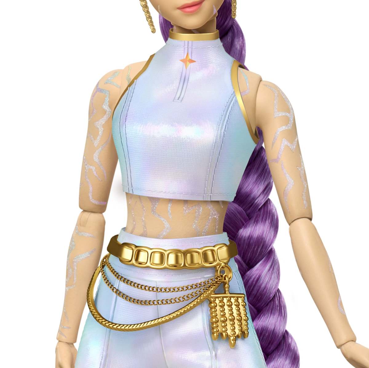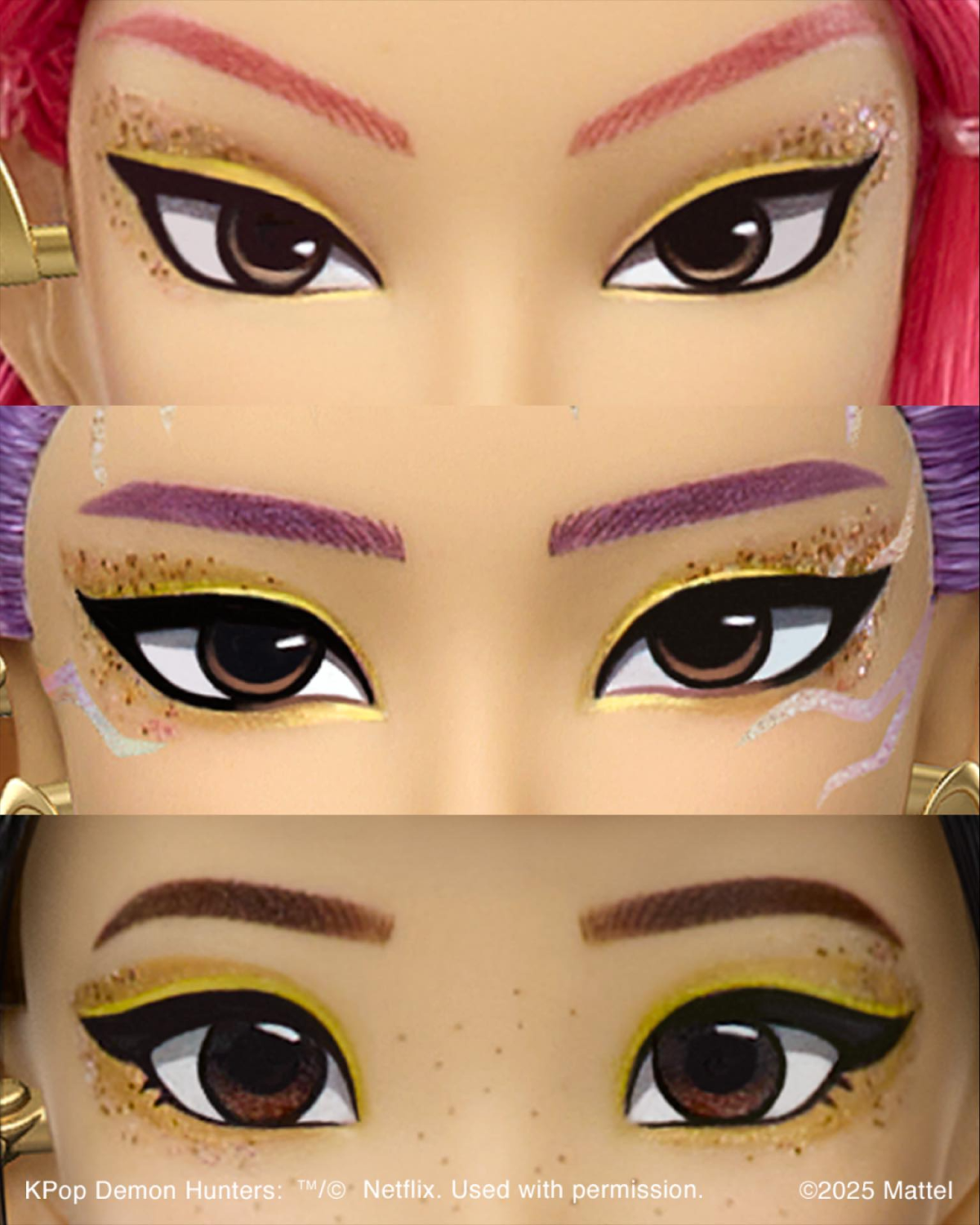 本次的娃娃套組參考電影最後 HUNTR/X 成員們演唱〈What It Sounds Like〉時的造型打造,以美泰兒多年來在芭比與精靈高校系列積累的精湛製偶技術呈現出魯米、米拉與佐依在劇中的模樣,服裝部分採用高質感布料剪裁還原標誌的白金配色表演服,並以植髮技術精緻再現三位角色的髮型,魯米身上的惡魔印記與成員們臉上的妝容也都被細膩的塗裝還原!