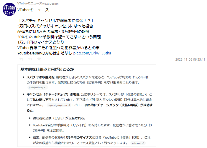 根據帳號「VTuberのニュース(@DaiDesign)」整理,假設觀眾送出一筆 5 萬日圓的 Super Chat,若後續被信用卡公司取消,YouTube 仍會照樣抽走 30% 的手續費,也就是說實況主得被追繳 5 萬日圓,但手上只拿到 3.5 萬的報酬,結果就變成 1萬5千日圓的虧損。